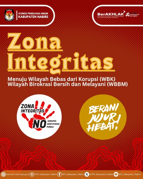 "KPU Kabupaten Nabire berkomitmen penuh dalam membangun Zona Integritas sebagai wujud nyata menuju Wilayah Bebas dari Korupsi (WBK) dan Wilayah Birokrasi Bersih Melayani (WBBM). Komitmen ini bukan sekadar slogan, melainkan langkah konkret untuk menghadirkan tata kelola kelembagaan yang transparan, akuntabel, dan berorientasi pada pelayanan publik yang berkualitas. Melalui penerapan prinsip integritas, KPU Kabupaten Nabire bertekad menjaga kepercayaan masyarakat dengan memastikan setiap proses berjalan sesuai aturan, bebas dari praktik korupsi, serta mengedepankan profesionalisme. Zona Integritas menjadi fondasi penting dalam memperkuat demokrasi di tingkat lokal. Dengan semangat kebersamaan, KPU Kabupaten Nabire mengajak seluruh jajaran dan masyarakat untuk mendukung terwujudnya birokrasi yang bersih dan melayani. Transparansi dalam setiap tahapan, akuntabilitas dalam setiap keputusan, serta integritas dalam setiap tindakan adalah komitmen yang terus dijaga demi terciptanya demokrasi yang bermartabat. Mari bersama-sama mendukung KPU Kabupaten Nabire dalam mewujudkan Zona Integritas, demi pelayanan publik yang lebih baik dan demokrasi yang semakin kuat di Kabupaten Nabire." ....