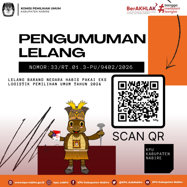 #TemanPemilih, Berikut ini Pengumuman Lelang KPU Kabupaten Nabire Nomor : 33/RT.01.3-PU/9402/2026 tentang Lelang Barang Negara Habis Pakai Eks Logistik Pemilihan Umum Tahun 2024. Untuk informasi selengkapnya dapat mengunduh Pengumuman Lelang melalui scan QR Code atau melalui Link ini: https://bit.ly/4kRSjdd #KPUMelayani #KPUKabupatenNabire ....