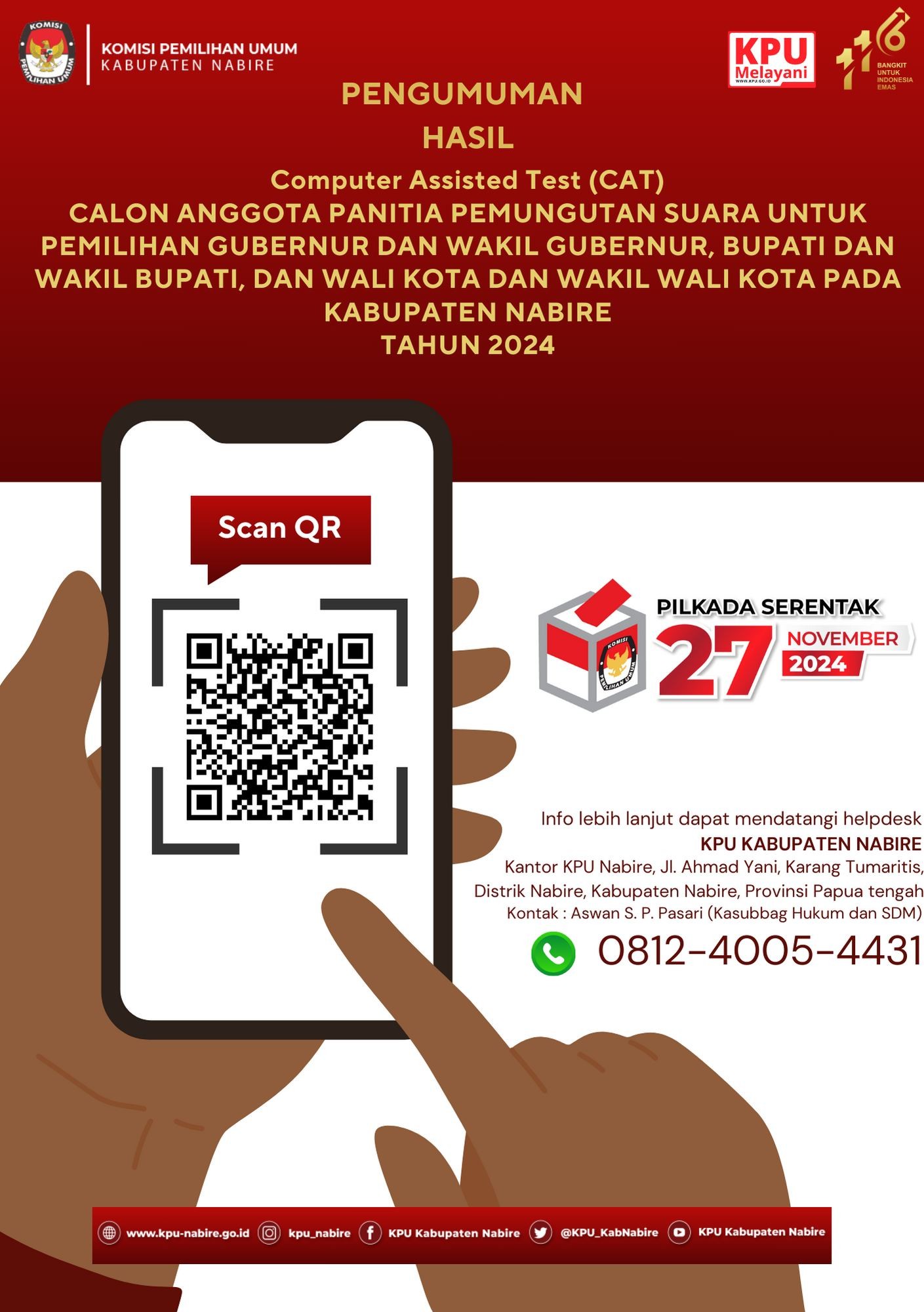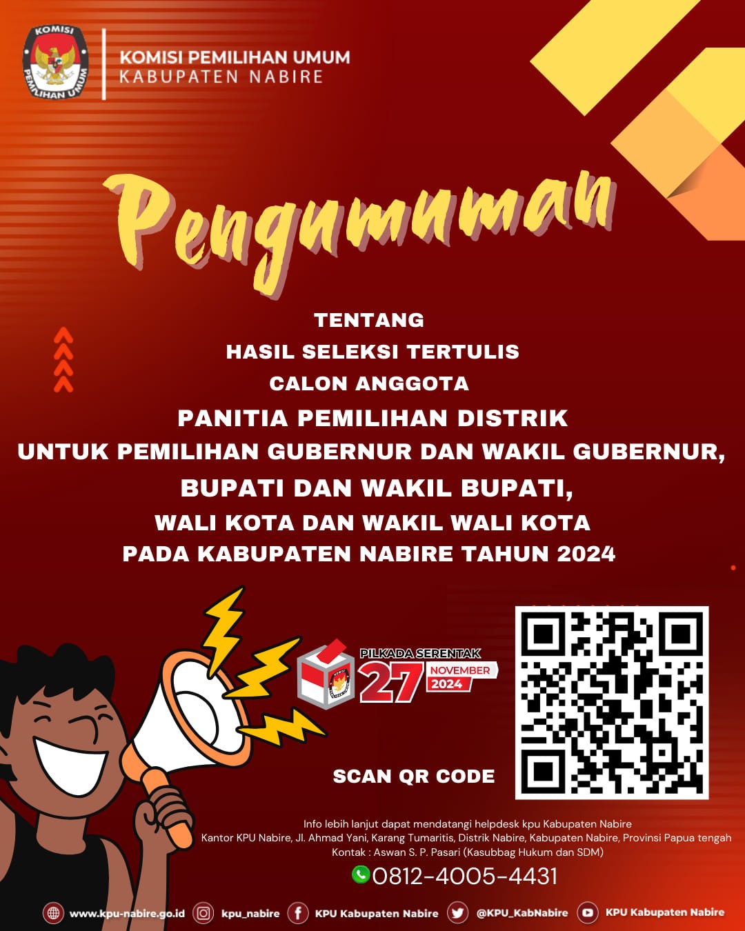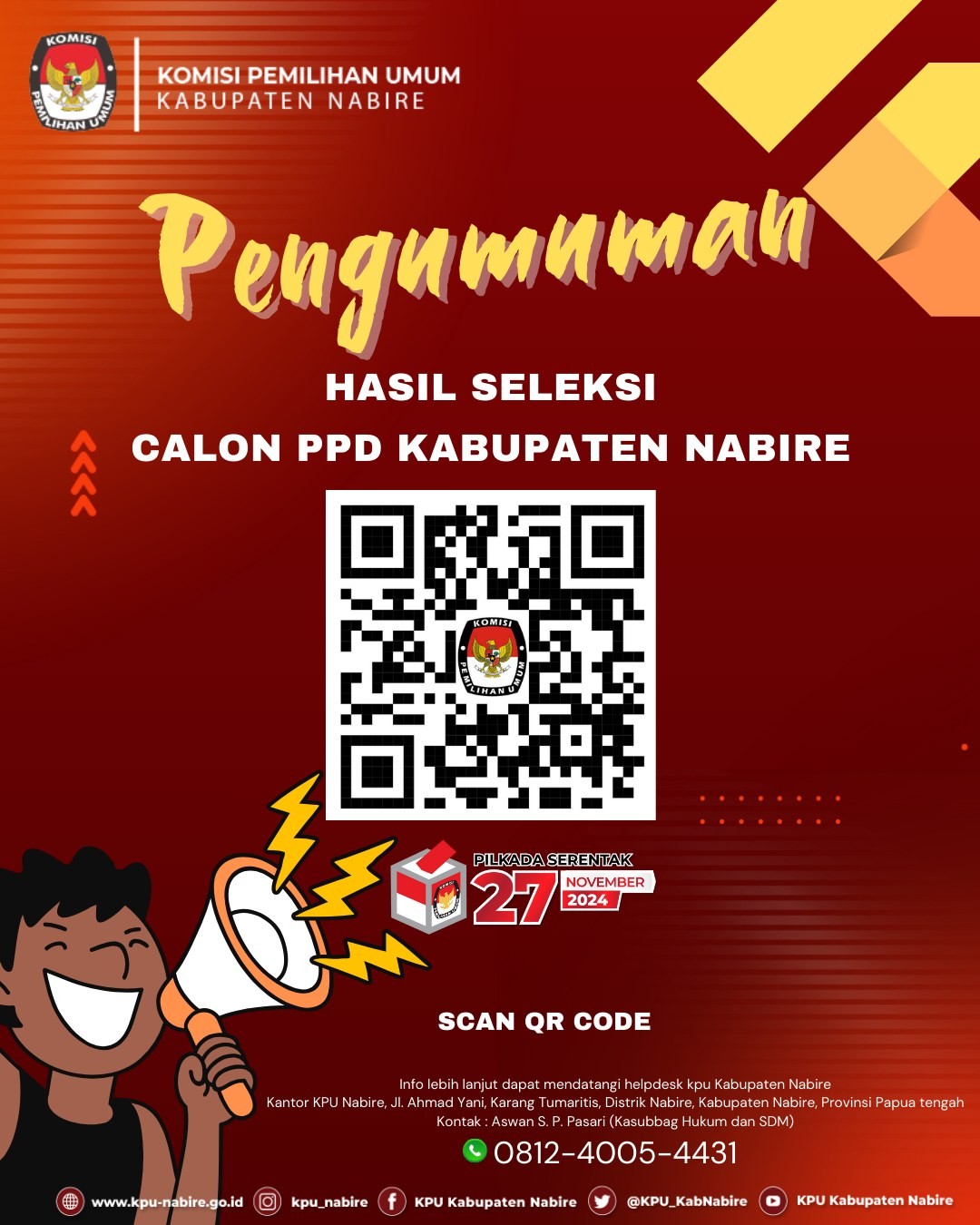 #TemanPemilih Berikut ini Pengumuman Pendaftaran Bakal Pasangan Calon Bupati dan Wakil Bupati Kabupaten Nabire Tahun 2024. Pendaftaran Pasangan Calon : 27 s.d 29 Agustus 2024 Helpdesk : Kantor KPU Kabupaten Nabire Jl. Ahmad Yani, Karang Tumaritis, Distrik Nabire, Kabupaten Nabire Link : https://bit.ly/SILONKPUNABIRE atau scan barcode di info grafis di bawah ini #KPUMelayani #PilkadaSerentak2024